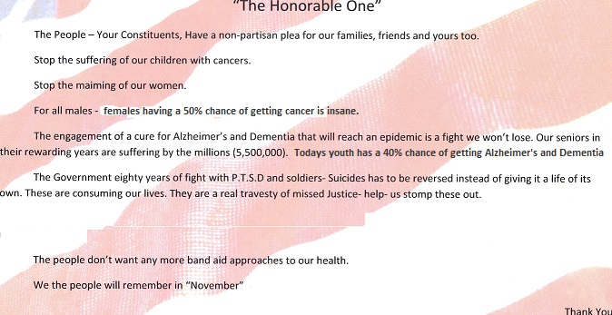 These are the Washington Representatives that received a letter and a National Health Petition for Life by Certified mail mid-December,2011. They were asked to sign it and send it back to the people.